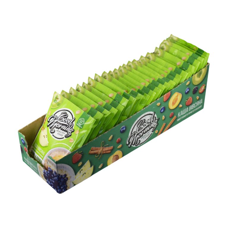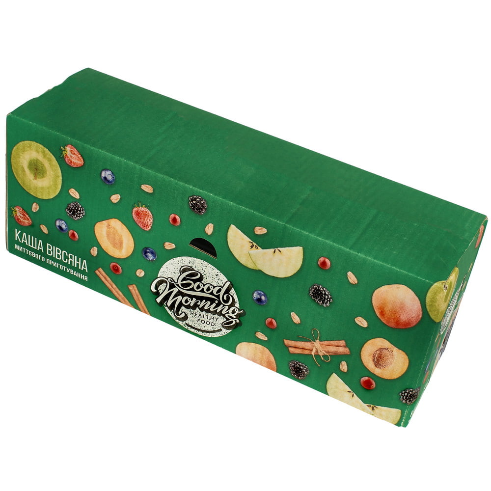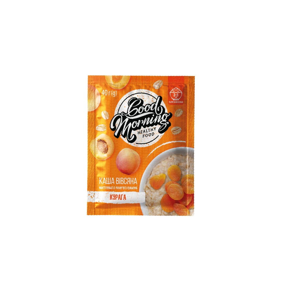Каша вівсяна миттєвого приготування «Курага» – це здоровий сніданок з натуральних вівсяних злаків і сухофруктів – запорука бадьорого настрою, енергії і прекрасного самопочуття на цілий день. Це концепція торгової марки GOOD MORNING.