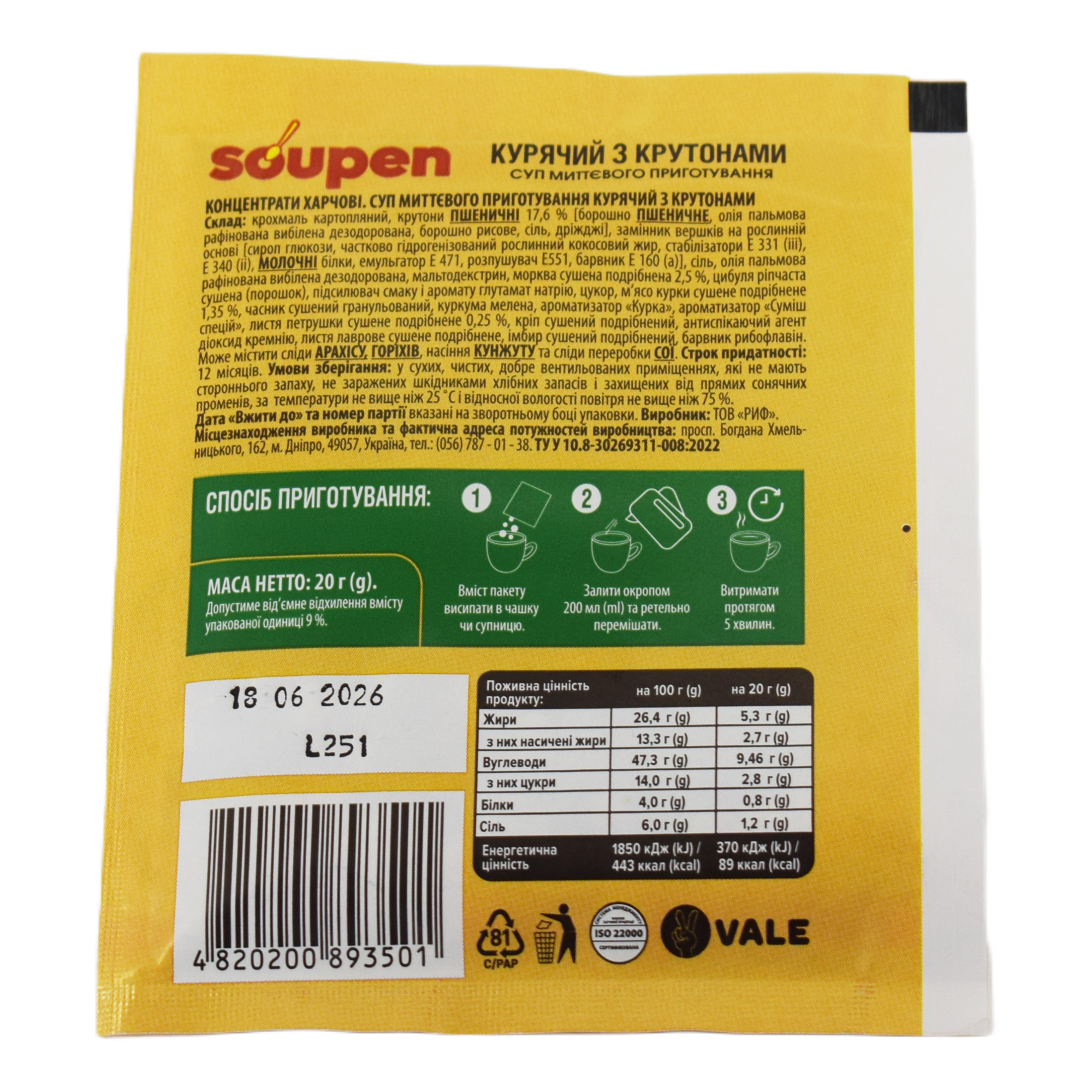 Склад: крохмаль картопляний, крутони ПШЕНИЧНІ 17,6% [борошно ПШЕНИЧНЕ, олія пальмова рафінована вибілена дезодорована, борошно рисове, сіль, дріжджі], замінник вершків на рослинній основі [сироп глюкози, частково гідрогенізований рослинний кокосовий жир, стабілізатори Е331 (ііі), Е340 (іі), МОЛОЧНІ білки, емульгатор Е471, розпушувач Е551, барвник Е160 (а)], сіль, олія пальмова рафінована вибілена, дезодорована, мальтодекстрин, морква сушена подрібнена 2,5%, цибуля ріпчаста сушена (порошок), підсилювач смаку і аромату глутамат натрію, цукор, м’ясо курки сушене подрібнене 1,35%, часник сушений гранульований, куркума мелена, ароматизатор “Курка”, ароматизатор “Суміш спецій”, листя петрушки сушене подрібнене 0,25%, кріп сушений подрібнений, антиспікаючий агент діоксид кремнію, листя лаврове сушене подрібнене, імбир сушений подрібнений, барвник рибофлавін. Може містити сліди АРАХІСУ, ГОРІХІВ, насіння КУНЖУТУ та сліди переробки СОЇ.