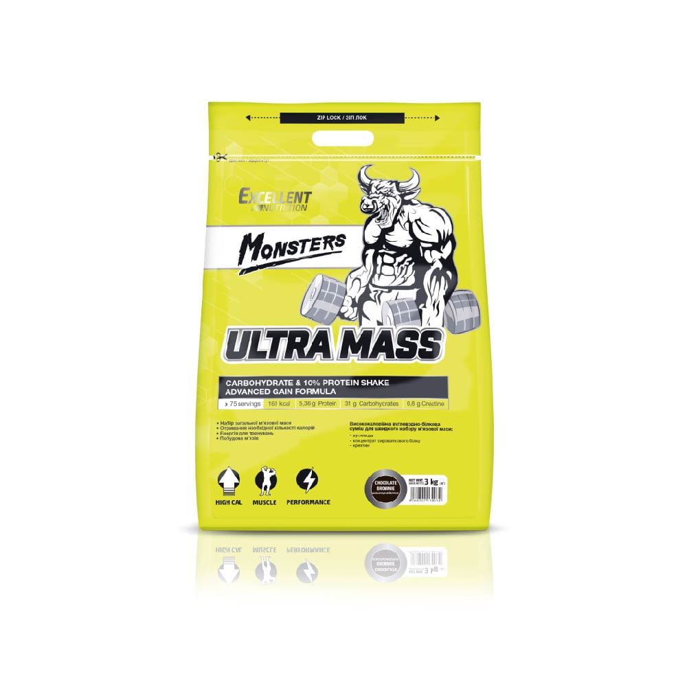 Гейнер ULTRA MASS – висококалорійна вуглеводно-білкова суміш, що містить вуглеводи, концентрат сироваткового білка, креатин. Необхідний для набору загальної м’язової маси і побудови м’язів. Забезпечує отримання необхідної кількості калорій протягом дня і енергії для тренувань.